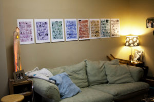 When Paddy first moved in here, the previous tenants offered to leave a few things behind (for a small fee). We got some decent patio furniture, a bbq, an air conditioner, and a rather large print of some cityscape. While there is no chance I will be getting rid of the patio furniture, the bbq, or the air conditioner until we have plenty of money to upgrade to shinier, fancier models, the photo has really just been filling space. It does this very well, but it’s really not ‘us’. At all. So, we’re saying goodbye to the print, and I’m finally hanging up some prints that I have been planning to since we were in Fredericton! I’ve had these awesome comics for a couple of years now: each frame depicts an entire Harry Potter novel (save the last book, which has 2 frames). They’re rather hilarious. I had been waiting to get them all properly framed or mounted, but finances haven’t allowed (8 frames is a lot, even if we go with cheap-o Walmart ones!) and so they’ve been sitting in a box. (Throwing things out, *and* emptying a box? It’s a good week!) I’m so much happier now that they’re up and displayed, all wonderfully nerdy and colourful on our wall! And if the command strips that I used damage the print, I have high resolution files that I can print again (major kudos to the artist for allowing that!!) Already the space feels better: there’s nothing like lovely,lighthearted Harry Potter fan art to geek-up a room! (If you’re interested in who made these awesome cartoon prints, you can find Lucy here: http://www.lucyknisley.com/about, although I couldn’t easily find the HP prints on her current site.)